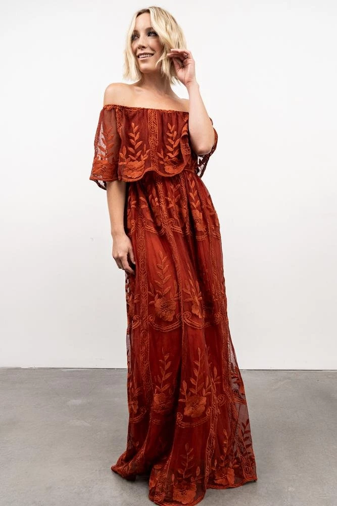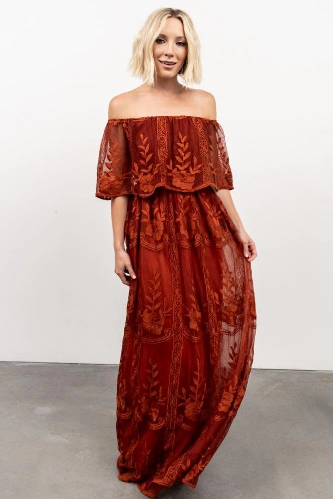 BB Custom Leon Off Shoulder Maxi Dress | Rust Dresses