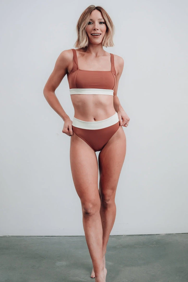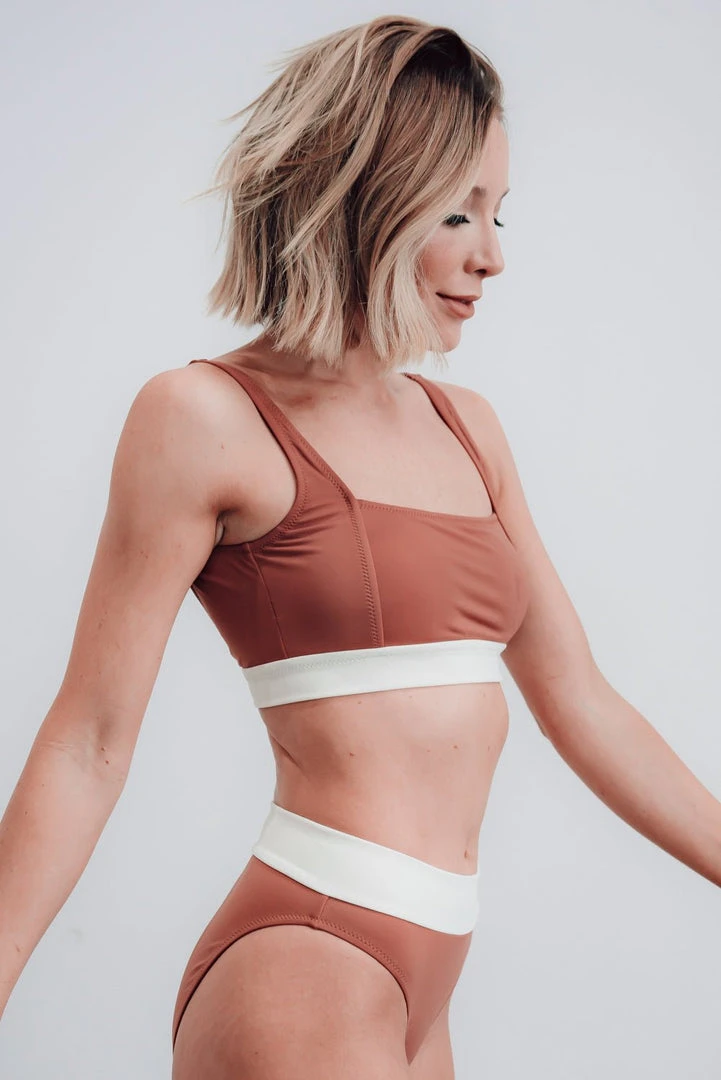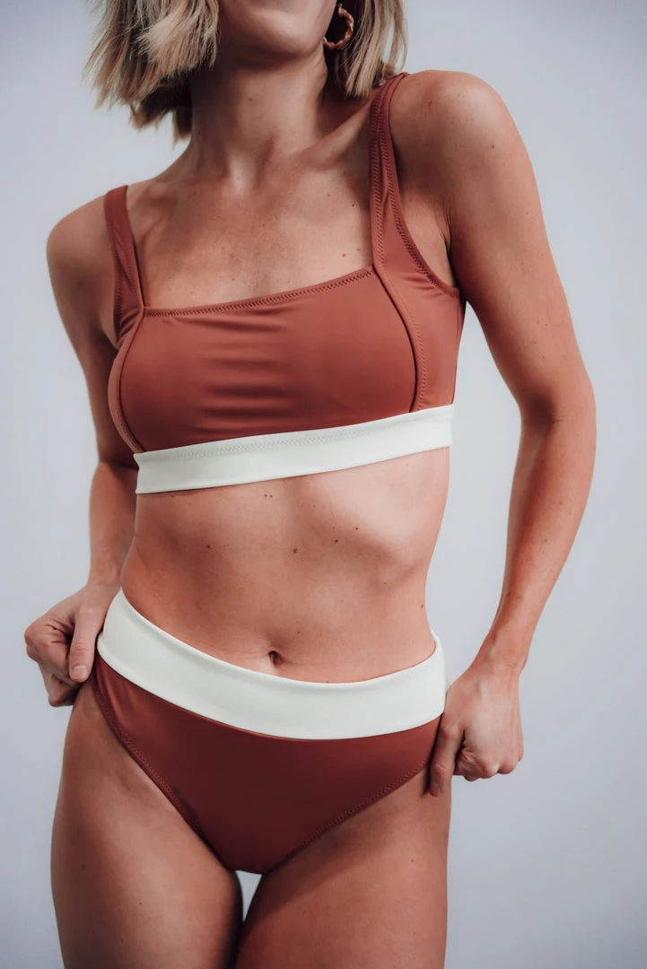 FINAL SALE. Trend alert! Say hello to one of our favorite bikini styles in a brand new color! With the flattering square neckline and white contrast band, all you need are the bottoms to match!Â