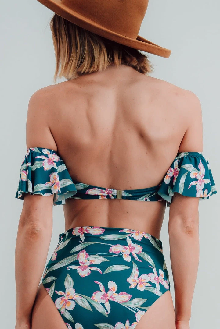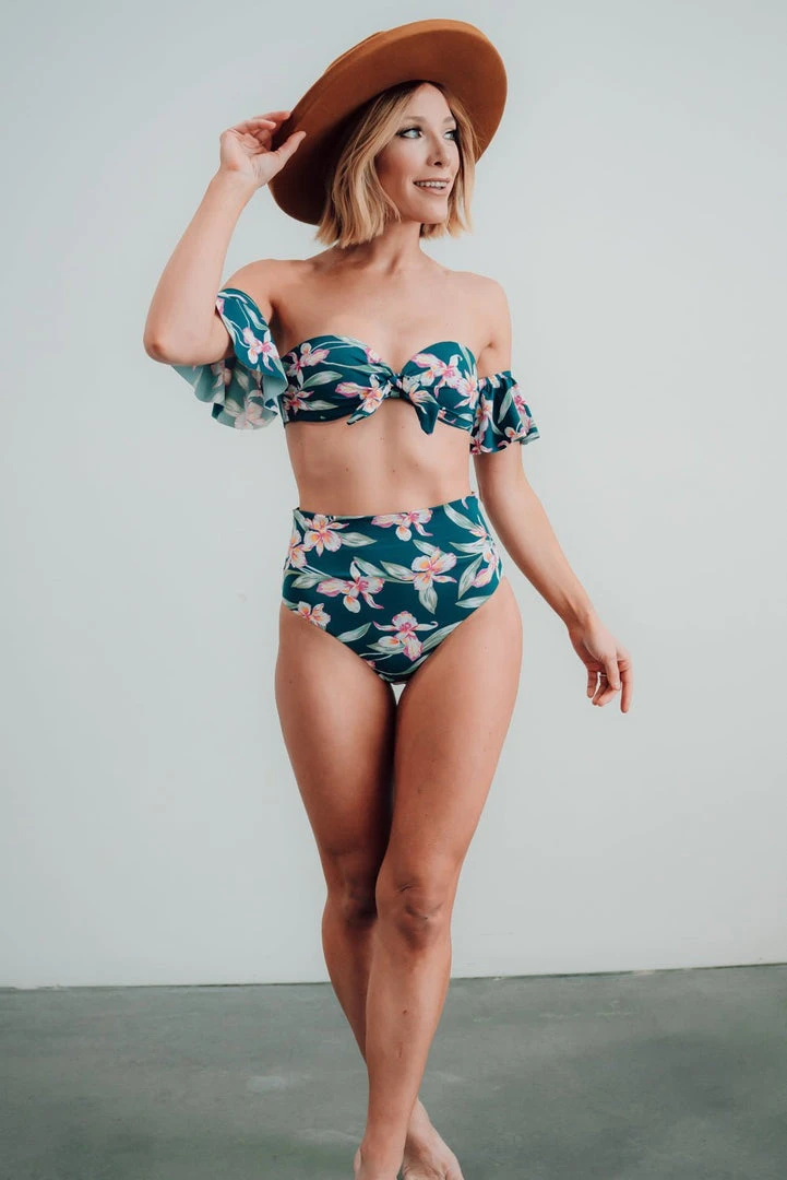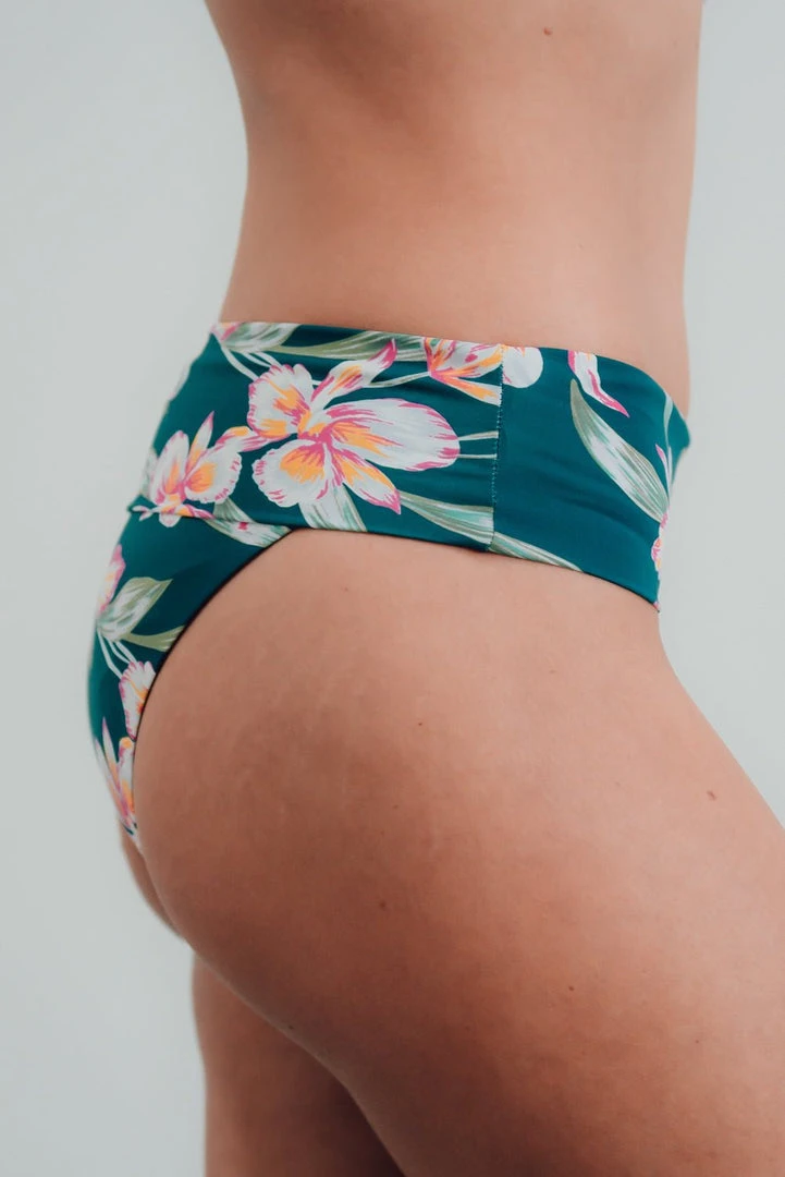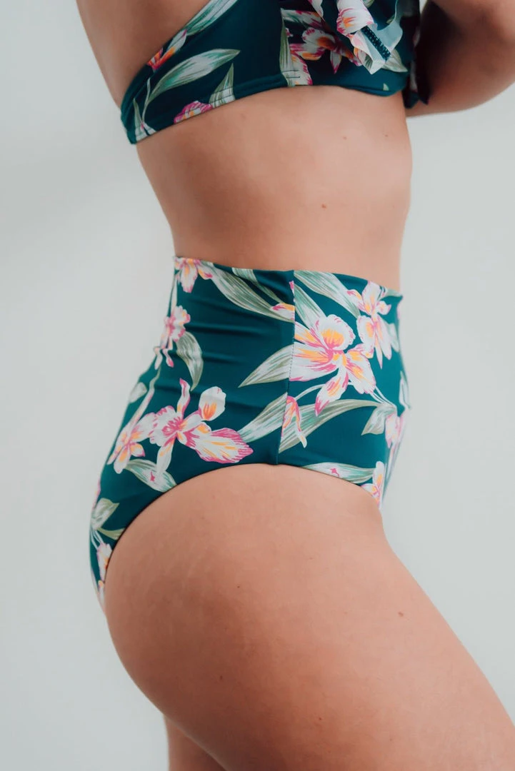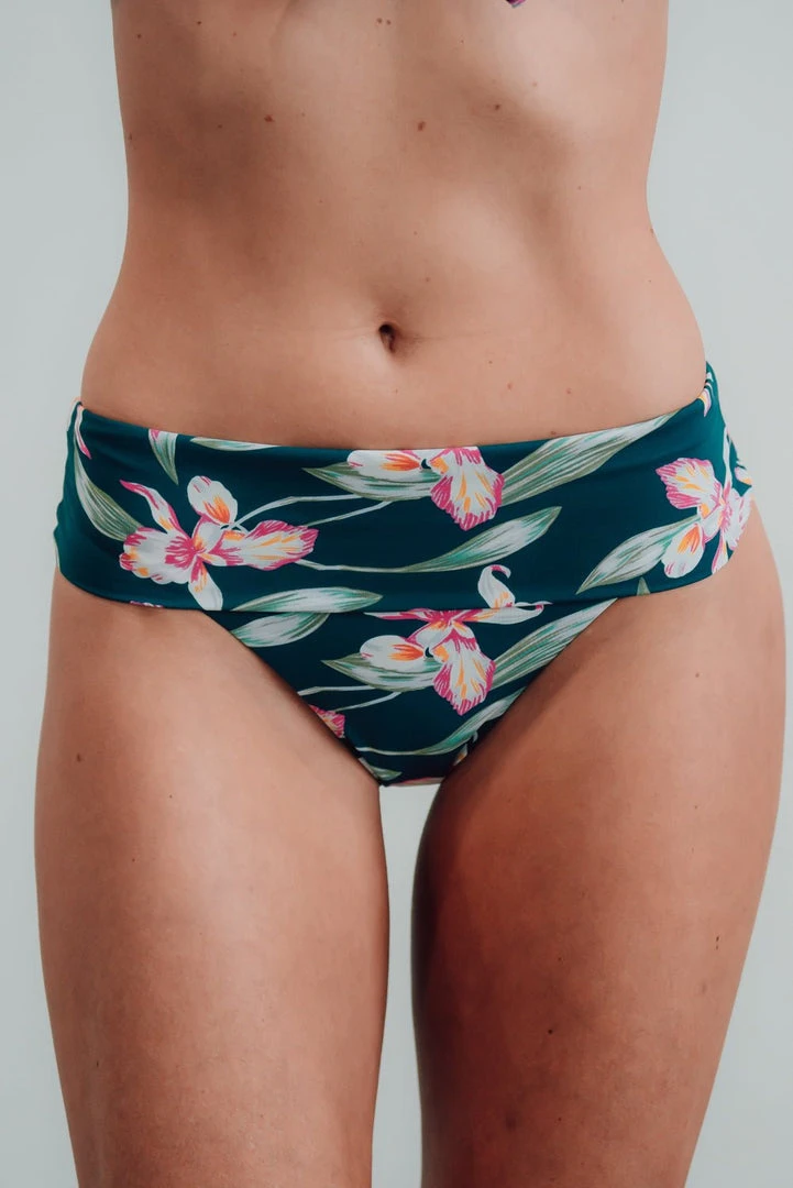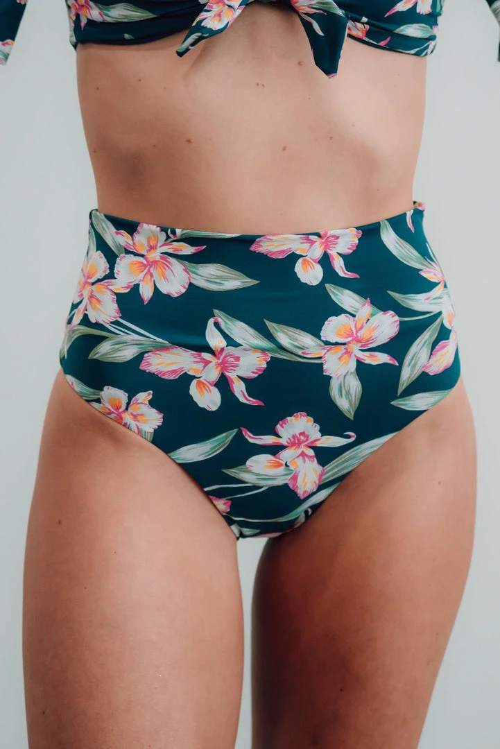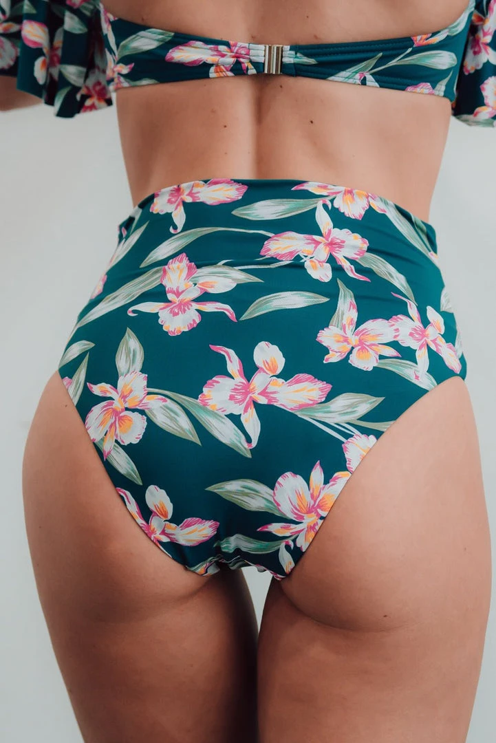 FINAL SALE. Dainty topaz floral high waisted bottoms, with the ability to be folded down to created a banded mid rise bottoms.. Do you know where this would be perfect to wear, Miami!Â