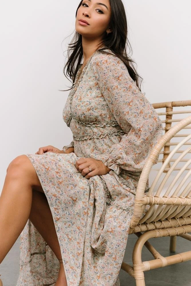 - Gorgeous flowing sage chiffon material with blue, ivory, and blush colored floral design throughout