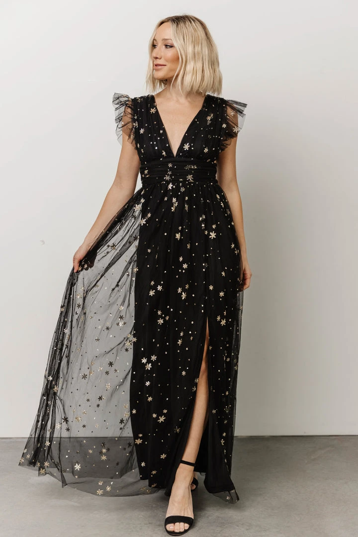 Be the first to review “Soi Dresses Nova Shimmer Maxi Dress | Black + Gold” Cancel reply